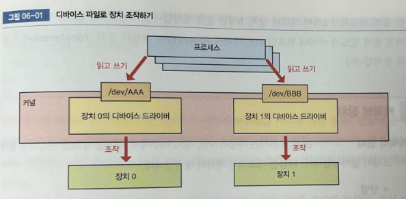 리눅스는 프로세스가 디바이스 파일을 조작, (디바이스 파일에 접근하는건 루트 뿐)
