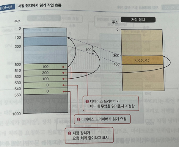 1 디바이스 드라이버가 저장 장치의 데이터를 메모리의 어디로 가져올지 지정함