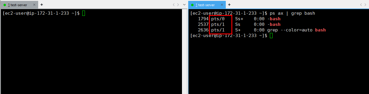 AWS로 서버 생성하여 확인해보니 해당 서버는 pts/0 단말을 사용 중이었음