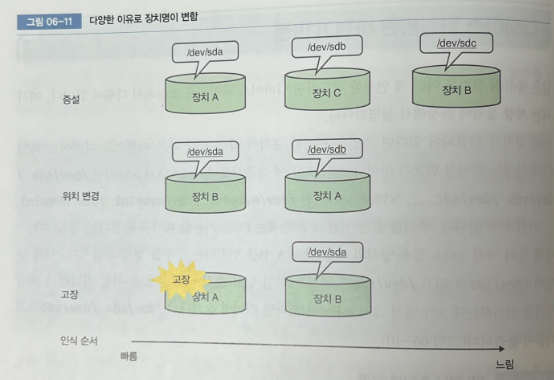 영구 장치명 /dev/disk/by-path 아래에 존재하는, 디스크 설치된 경로 위치 정보가 있는 디바이스 파일이 있음